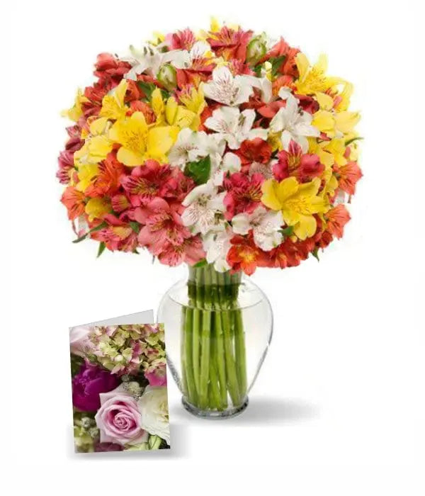 This special Mother’s Day package includes 50 blooms of assorted-color Alstroemeria and a full-size Mother’s Day card to personalize your heartfelt gift on her special day.