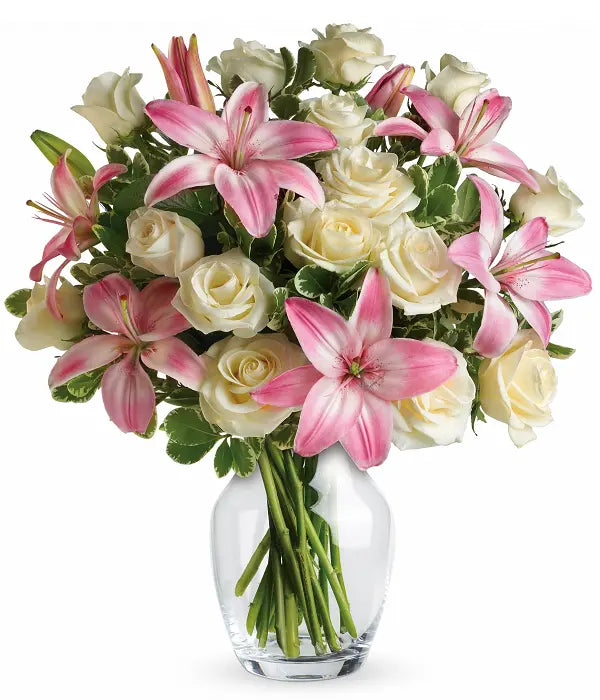 Send a message of romance with this stunning bouquet, a beautiful display of roses and lilies crafted to leave a lasting impression on any lucky recipient. Featuring gorgeous white roses paired with romantic pink Asiatic lilies, all hand-arranged with fresh greens, it’s the perfect way to show that your love is forever and always. Measures approximately 15.5 inches wide by 18 inches high. Vase not included.