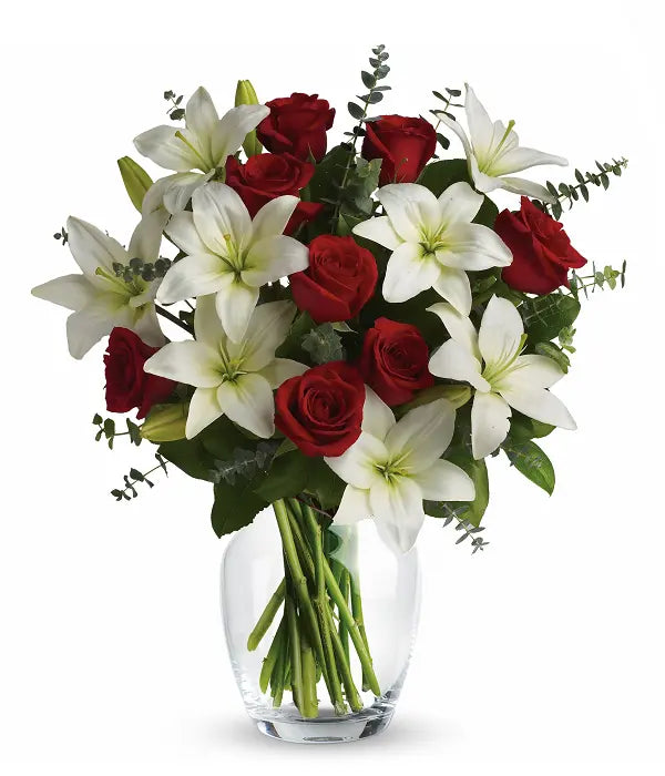 Surprise that special someone with a stunning bouquet designed to impress. This perennial best-seller features crisp white Asiatic lilies paired with nine deep, plump red roses—a beautiful contrast of vibrant color and timeless elegance. Accented with fragrant eucalyptus, this arrangement is perfect for romantic gestures, anniversaries, or just because. Vase not included—available for purchase as an optional "Extra Touch." Ideal for delivery to homes or offices.