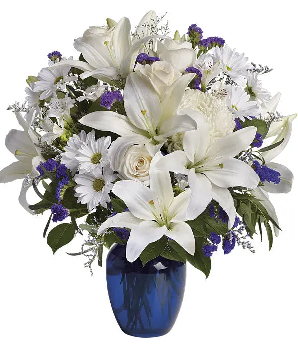 This serene bouquet beautifully blends the peace of blue with the purity and grace of white, making it a thoughtful expression of strength and support during times of loss. Featuring a delicate selection of cream roses, white lilies, hydrangea, alstroemeria, white chrysanthemums, eucalyptus, and more. Measures approximately 15.5 inches wide by 16.5 inches high. Vase not included—available for purchase at checkout.