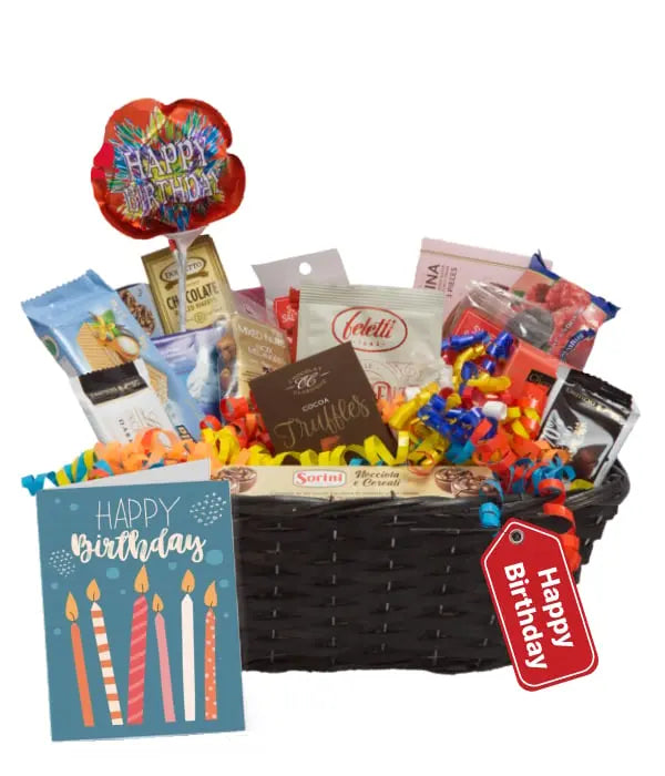 The "Birthday Gourmet Collection III" Gift Basket contains seventeen (17) gourmet items and includes any combination of the following gourmet treats; Decadent Lindt Lindor Chocolates, Italian Gellies Treats, Sorini Italian Chocolates, Chocolate Tortina, Tarrali Fenouil, Italian Wafer Cookies, Beligian Truffles, Yogurt Raisin Snacks, Ice Wine Milk Chocolates, Milk Chocolate Maple Balls, assorted Chocolates, Sticky Caramel Corn, Licorice Allsorts, chewy Wine Gums, crispy Water Crackers, Milk Chocolate Chips, Chocolate Chip Cookies, Butter Cookies, Orange Cream Cookies, Cherry Cream Cookies, Orange Tea, Peppermint Tea, Assorted Chocolate Bars, Krakus Cherry Biscuits, Vanilla Wafer Rolls, Buttery Tea Biscuits, Traditional Highland Shortbread Cookies, crispy Cocoa Wafers, Vanilla Wafers, Butterfly Cookies, Butter Toffee Pretzels, Sweet Pastry Cookies, Chocolate Wafer Cookies, Chocolate Truffle Cookies, Chocolate Crunch Cookie, Almond Roca, Chocolate Cream Puffs, Sorrento Chocolate Truffle Cocoa, Highland Select Tea, Wolf Gang Puck Coffee, Cafe Mocha Mix, healthy Sunflower Chips, Black Three Pepper Crackers, Morgan's Licorice Petites, Russel Stovers Chocolates, Petite Fruit Candies, Assorted Rail Fruit Candies, Assorted Petite Maman Jams and/or creamy Chocolate Taffy. The "Birthday Gourmet Collection III" also includes a 4" Mylar Birthday Balloon and a Full Size Birthday Card to put your Birthday Wishes to paper.