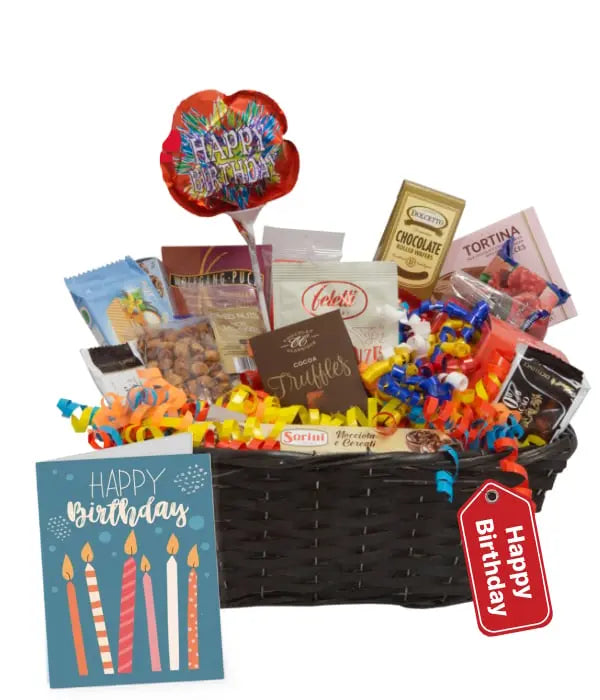 The "Birthday Gourmet Collection IV" Gift Basket contains twenty-four (24) gourmet items and includes any combination of the following gourmet treats; Decadent Lindt Lindor Chocolates, Italian Gellies Treats, Sorini Italian Chocolates, Chocolate Tortina, Tarrali Fenouil, Italian Wafer Cookies, Beligian Truffles, Yogurt Raisin Snacks, Ice Wine Milk Chocolates, Milk Chocolate Maple Balls, assorted Chocolates, Sticky Caramel Corn, Licorice Allsorts, chewy Wine Gums, crispy Water Crackers, Milk Chocolate Chips, Chocolate Chip Cookies, Butter Cookies, Orange Cream Cookies, Cherry Cream Cookies, Orange Tea, Peppermint Tea, Assorted Chocolate Bars, Krakus Cherry Biscuits, Vanilla Wafer Rolls, Buttery Tea Biscuits, Traditional Highland Shortbread Cookies, crispy Cocoa Wafers, Vanilla Wafers, Butterfly Cookies, Butter Toffee Pretzels, Sweet Pastry Cookies, Chocolate Wafer Cookies, Chocolate Truffle Cookies, Chocolate Crunch Cookie, Almond Roca, Chocolate Cream Puffs, Sorrento Chocolate Truffle Cocoa, Highland Select Tea, Wolf Gang Puck Coffee, Cafe Mocha Mix, healthy Sunflower Chips, Black Three Pepper Crackers, Morgan's Licorice Petites, Russel Stovers Chocolates, Petite Fruit Candies, Assorted Rail Fruit Candies, Assorted Petite Maman Jams and/or creamy Chocolate Taffy. The "Birthday Gourmet Collection IV" also includes a 4" Mylar Birthday Balloon and a Full Size Birthday Card to put your Birthday Wishes to paper.