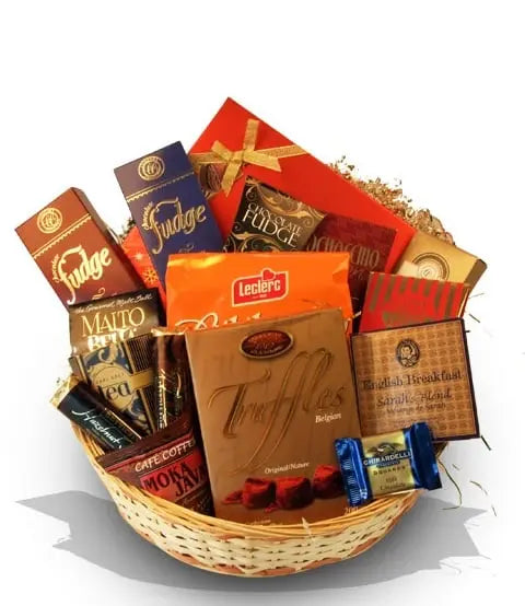 This delicious basket is filled with savoury truffles, chocolate and fudge. The perfect gift for a chocolate lover, this basket has it all! The "Chocolate Supreme" Gift Basket contains fourteen (14) gourmet items and includes any combination of the following Chocolate gourmet treats; Chocolate Crackle Cookies, Roasted Almonds, Chocolate Salted Caramel Cookies, Lindt Lindor Milk Chocolate, Belgian Truffles, Dark Chocolate Truffles, Baci Chocolate Pralines, Chocolate Covered Graham Crackers, Chocolate Wafer Cookies, Almond Roca Toffee, Chocolate Primo Dolce Truffle Cookies, Chocolate Milano Biscotti, Dark Chocolate Bars and Lindt Excellence DARK Chocolate. Measures Approx 10"W x 15"H