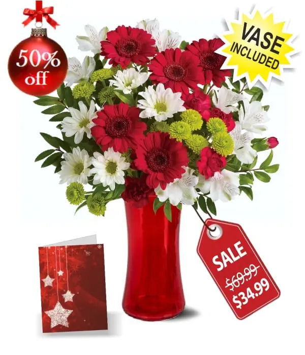 A breathtaking multiple bloom bouquet of seasonally themed flowers featuring long lasting white and red Daises, white Alstromeria, green Cushion Mums and seasonal greens artfully arranged in a cranberry red glass vase. Includes full size Christmas Card to send your Holiday Wishes.