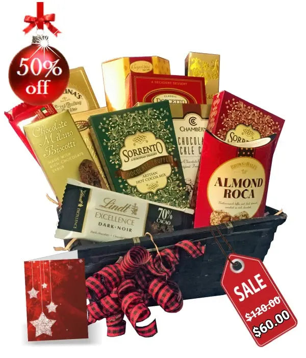 Our Gift Basket Gourmets have hunted down the most decadent treats ever and used them to create this Holiday theme gift basket full of tempting treats. Comprised solely of the most luxurious treats this completely irresistible vision of a gift basket is as good as it gets. Call it what you will - we call it the Best Deal in Town - period!