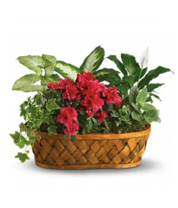 Brighten someone's day with this charming and long-lasting planter basket, ideal for saying thank you, get well, happy birthday, or thinking of you. Measuring 10 inches long by 6 inches wide, this beautifully arranged gift features two assorted blooming plants and one lush green plant. Seasonal variations may affect plant colors, ensuring each basket is a unique and thoughtful surprise. A low-maintenance gift that brings lasting joy and natural beauty to any space.