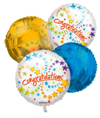 Our "Congratulations" Balloon Bouquets always bring the biggest smiles! Show that special someone just how much you really care with this sure to delight Balloon Bouquet. Send our Congratulations Balloon Bouquet today. Featuring 4 helium filled Mylar balloons, 2 balloons display Congratulations graphics - 2 are solid coloured. A great way to brighten someone's day. Same Day Balloon Bouquet delivery is available to all major cities in Canada. Our combination of brightly colored Balloon Bouquets say it best. They will remember this Balloon Bouquet Delivery for years to come!