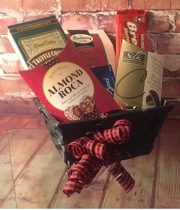 The "Country Christmas Gift Basket II" contains six (6) gourmet items and includes any combination of the following gourmet treats: Chocolate Crackle Cookies, Roasted Almonds, Chocolate Salted Caramel Cookies, Salt Water Taffy, Caramelized Belgian Cookies, Wolfgang Puck Euro Style Coffee, Lindt Lindor Milk Chocolate, Three Pepper Blend Water Crackers, Cafe Latte Barista Blend, Belgian Truffles, Dark Chocolate Truffles, Sweet Butter Cookies, Baci Chocolate Pralines, Chocolate Covered Graham Crackers, Napa Valley Honey Mustard Sourbough Nuggets, Chocolate Wafer Cookies, Almond Roca Toffee, California Rail Fruit Candy, Primo Dolce Truffle Cookies, Chocolate Milano Biscotti, Dark Chocolate Bars and Lindt Excellence DARK Chocolate.Â