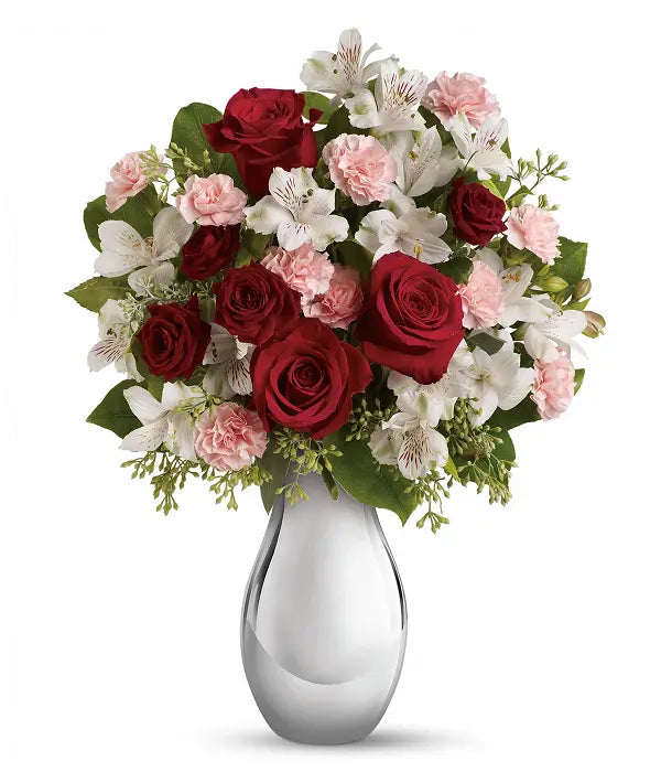 Ignite her heart with this breathtaking bouquet that captures the essence of romance. Featuring classic red roses paired with delicate pink carnations and other stunning blooms, this arrangement is sure to delight. Includes red roses, red spray roses, white alstroemeria, and pink miniature carnations, beautifully accented with lush greenery. Measures approximately 13 inches wide by 17.5 inches high. Vase not included—available for purchase at checkout.