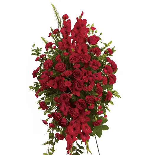 This elegant spray features roses, carnations, and other rich red flowers, thoughtfully arranged to convey sympathy and support during difficult times. A heartfelt expression of care and compassion. Easel not included—available at the funeral home. Please note, this arrangement is not available for same-day delivery.