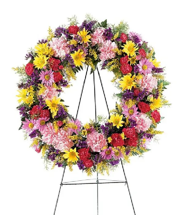 Wreaths are a traditional and heartfelt choice for funerals and commemorative events. This lovely wreath of mixed flowers, featuring bright colors, offers a beautiful expression of love and support, bringing a comforting and uplifting presence to any service. Please note, this wreath is not available for same-day delivery.