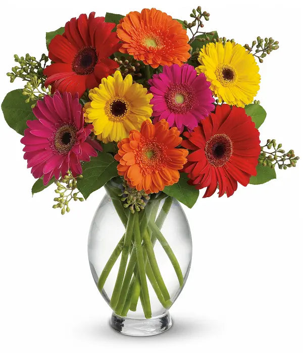 Sending this bouquet is always a bright idea! Celebrate summer’s cheer with vivid gerberas bursting with color, character, and charm. This lively arrangement features hot pink and red gerberas paired with fresh, contrasting greenery. Measures approximately 13.5 inches wide by 15 inches high. Vase not included.