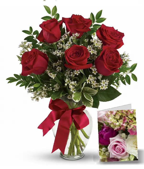 Express love, passion, and romance with one half-dozen sensational long-stemmed red roses and a full-size card. Traditionally symbolizing sincere and romantic love, these large, plump, robust roses are specially grown for lasting beauty. Includes 6 stunning fresh-cut, long-stemmed roses accented with limonium and fresh greens. Delivered fresh, budding, and ready to bloom for lasting enjoyment. Vases are available at checkout.