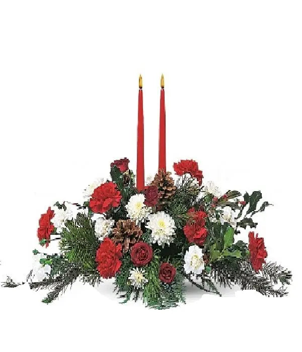 Holiday Dinner plans? Featuring a combination of fresh cut, seasonally themed, flowers elegantly bedded with fragrant pine boughs and accented with traditional Pine Cones, this decorative centerpiece will make any dinner even more delicious.