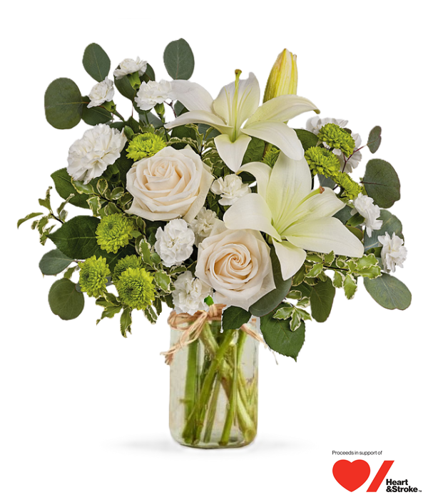This ethereal arrangement is a calming, peaceful gesture that shows them you care. Elegant white blooms accompany a trendy Mason Jar.