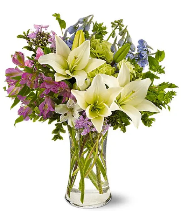 This beautiful bouquet evokes the serene dreams of ocean breezes and sweet floral scents. Featuring an exquisite mix of white Asiatic lilies, blue delphinium, green carnations, purple phlox, and purple and white alstroemeria, accented with lush greens, it’s the perfect choice for any occasion. Measures approximately 13 inches wide by 15 inches high. Vase not included.