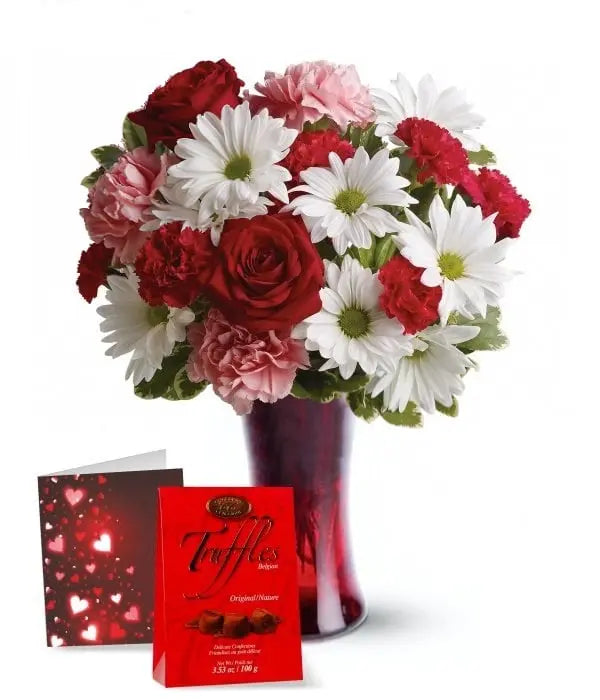 Delight your loved one with this beautiful bouquet featuring bright white chrysanthemums, precious pink and red carnations, romantic red roses, and fresh greenery. This special value package includes the bouquet, decadent truffles, and a full-size card for your heartfelt message. Vase not included—available for purchase at checkout.