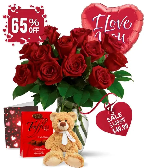 Special "Just Because" package includes One Dozen (12), plump, Red Roses, decadent Belgium Truffles (100gr), cuddly Teddy Bear, 9" Mylar "I Love You" Balloon and a full size Greeting Card to put your thoughts to paper.