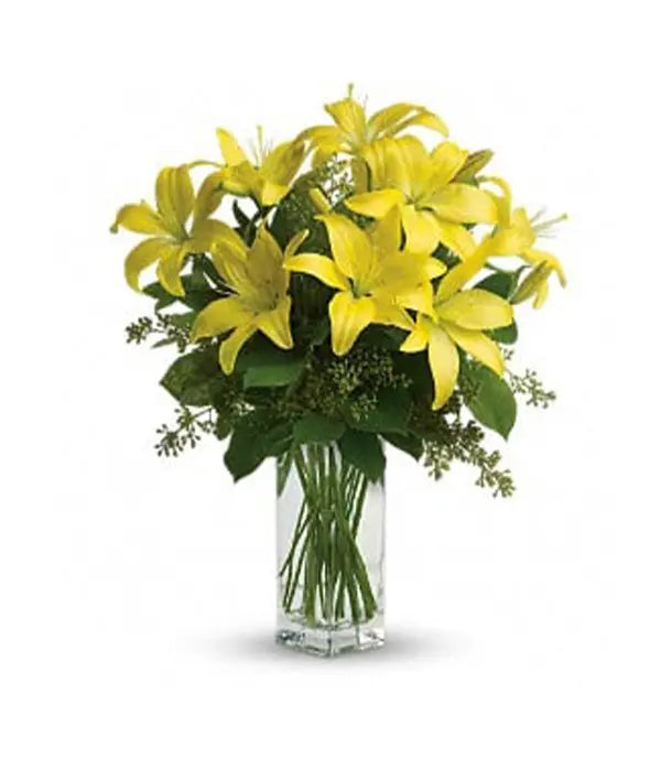 The lily reigns as the queen of spring flowers, and this gorgeous bouquet is bursting with cheerful yellow blooms that bring sunshine to any space. Featuring vibrant yellow Asiatic lilies complemented by fresh salal and seeded eucalyptus, this radiant arrangement measures approximately 16.25 inches wide by 20.25 inches high. Vase not included—available for purchase as an optional "Extra Touch."