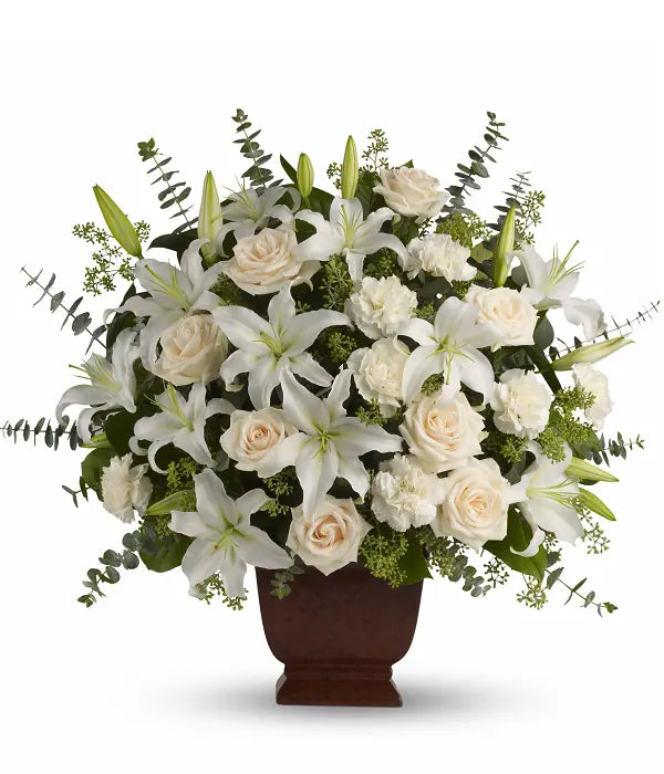 Show your heartfelt sympathy with this simply stunning arrangement, perfect for offering comfort to those mourning a loss. This elegant bouquet features cream roses, white lilies, delicate carnations, fresh eucalyptus, and more, thoughtfully arranged to convey your caring thoughts. Measures approximately 27 inches wide by 25 inches high. Comes with a white plastic urn for a polished presentation.