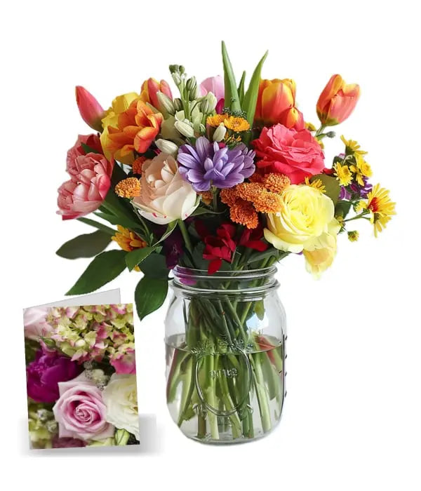 Celebrate Mom with a lively splash of spring’s finest blooms! This vibrant bouquet brings together soft roses, graceful alstroemeria, cheerful chrysanthemum daisies, and fresh spring tulips, all thoughtfully gathered in a charming mason jar.