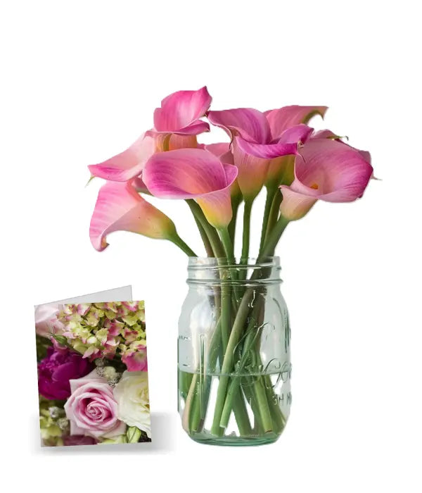 Make a lasting impression with a stunning bouquet of fresh pink calla lilies elegantly arranged in a stylish mason jar.