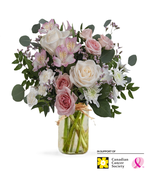 Bouquet includes plump Cream Roses, pink Spray Roses, delicate Pink Alstroemeria, miniature White Carnations, white Cushion Spray Chrysanthemums and Pink Limonium tastefully arranged with Silver Dollar Eucalyptus and Huckleberry. This arrangement is delivered in a trendy Mason Jar.