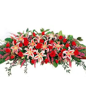 A modern twist on the classic funeral casket arrangement, this tasteful design features traditional red roses accented with pink stargazer lilies, purple snapdragons, and asters. It offers a respectful and colorful way to celebrate the departed's life. Delivered fresh, budding, and ready to bloom for lasting beauty. Full-size sympathy cards are available at checkout. Please note, this arrangement is not available for same-day delivery.