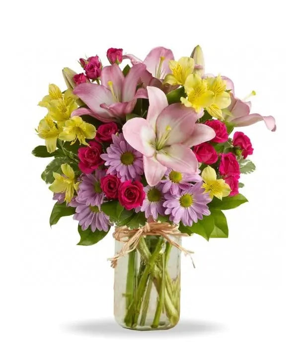 Welcome spring with a vibrant mix of pink, yellow, and lavender flowers beautifully arranged in a mason jar. This dazzling bouquet is a perfect gift to brighten someone’s day and bring joy for years to come. Mason jar included.