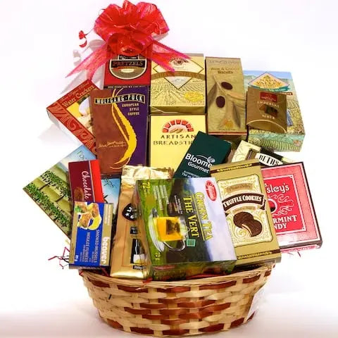 This special gourmet gift is a great holiday greeting for friends and familly. It is filled with premium ingreadients and sure to delight your recipients this season.Gift Basket contains eighteen (18) gourmet items and includes any combination of the following gourmet treats; Chocolate Crackle Cookies, Roasted Almonds, Chocolate Salted Caramel Cookies, Salt Water Taffy, Caramelized Belgian Cookies, Wolfgang Puck Euro Style Coffee, Lindt Lindor Milk Chocolate, Three Pepper Blend Water Crackers, Cafe Latte Barista Blend, Belgian Truffles, Dark Chocolate Truffles, Highland Select Tea, Sweet Butter Cookies, Baci Chocolate Pralines, Chocolate Covered Graham Crackers, Napa Valley Honey Mustard Sourbough Nuggets, Chocolate Wafer Cookies, Almond Roca Toffee, California Rail Fruit Candy, Primo Dolce Truffle Cookies, Chocolate Milano Biscotti, Dark Chocolate Bars and Lindt Excellence DARK Chocolate.Product may not appear as per image - Not Available for Same Day DeliveryÂ
