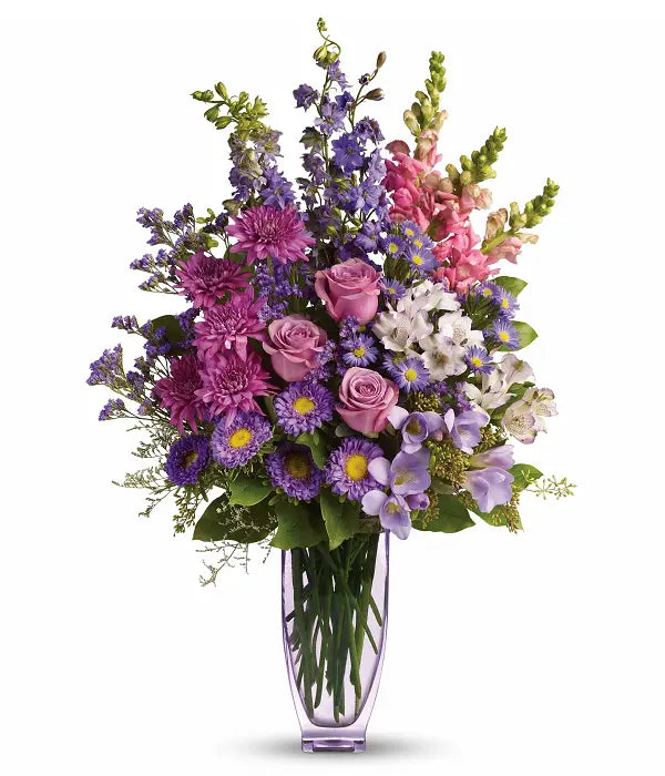 This gorgeous gift commands attention, standing over two feet tall as a spectacular expression of how much your lucky recipient means to you. Graceful lavender roses blend harmoniously with alstroemeria and other pastel blooms, complemented by pink snapdragons, purple asters, and statice. A stunning bouquet sure to steal the show and warm any heart. Measures approximately 18 inches wide by 27 inches high. Vase not included.