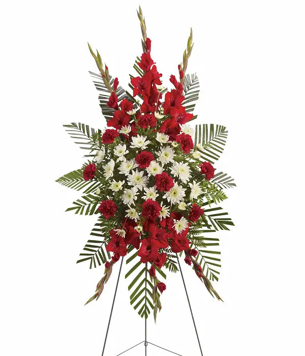 This beautiful spray of white and red blooms reflects your good taste and heartfelt care, making it an impeccable choice for any memorial. Easel not included—available at funeral homes.