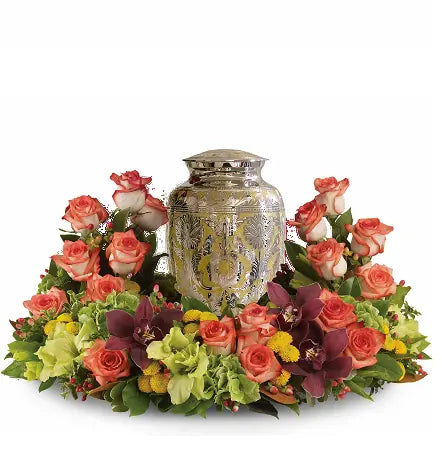 Like a colorful and peaceful garden, this beautiful arrangement conveys thoughtful sympathy and honors your most cherished memories. Please note, urn is not included.
