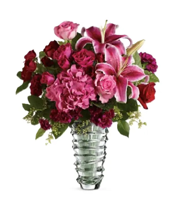 No one captured romantic passion quite like Shakespeare, and this exquisite bouquet of fresh blooms is sure to help you wow the special lady in your life. Featuring a stunning mix of red roses, pink roses, red spray roses, hot pink spray roses, pink oriental lilies, purple carnations, and purple miniature carnations, all artfully arranged with fresh greenery. Measures approximately 19 inches wide by 22 inches high. Vase not included.