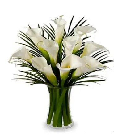 This elegant arrangement features 10 beautiful stems of calla lilies supported by distinctive trumpet-shaped leaves and fresh greens. Perfect as a corporate gift or for anyone with unique and refined floral taste, even a single bloom in a vase creates a stunning impression. Stands approximately 22 inches tall. Delivered fresh, budding, and ready to bloom for lasting beauty. Vases and greeting cards are available at checkout.