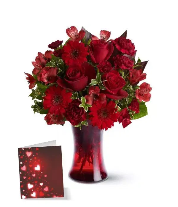 The bouquet includes a designer’s choice of at least 12 premium stems — either a romantic mix of Valentine-themed flowers or a full bouquet of classic red roses. A full-size Valentine’s Day card is also included for that heartfelt finishing touch.