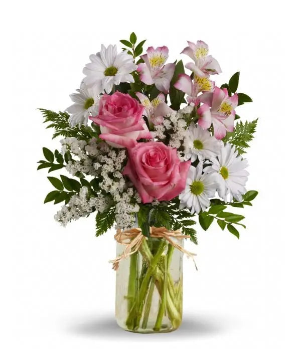 Featuring pink roses, pink alstroemeria, white daisy spray chrysanthemums, and white statice, accented with lush greenery, this bouquet measures approximately 9" wide by 14" high. Mason jar included.