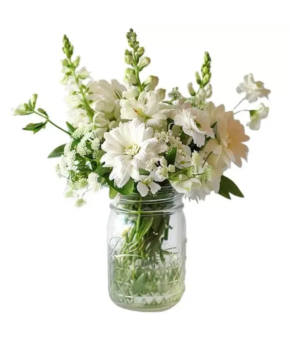 Immerse yourself in the serene beauty of our elegant white blooms arranged in a mason jar. This graceful bouquet features soft white daisies, delicate snapdragons, and airy filler flowers, all nestled in a timeless mason jar. With its pure and calming hues, it’s perfect for weddings, anniversaries, or as a thoughtful gesture to brighten someone’s day. The simplicity and elegance of this arrangement add a touch of sophistication to any space, making it an ideal centerpiece for home or office décor.