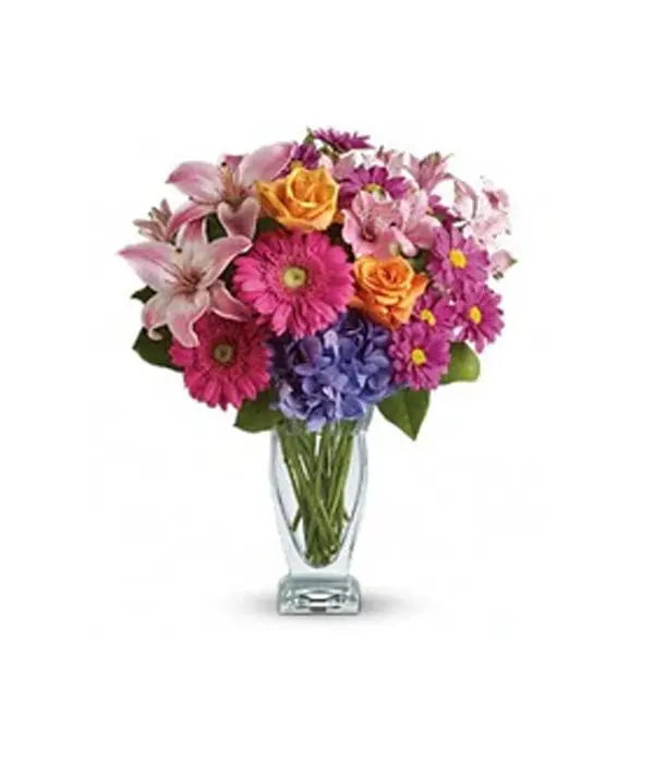 This enchanting bouquet is filled with wishes and magic, artfully blending vibrant blooms to delight and inspire. Featuring rich orange roses, pink Asiatic lilies, hot pink gerberas, pink alstroemeria, and purple chrysanthemums, it’s the perfect way to send wonder and joyful wishes. Measures approximately 14.5 inches wide by 17 inches high. Vase not included—available for purchase as an optional "Extra Touch."